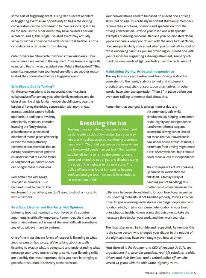 How to Have the Difficult Driving Conversation Click here to read the Alzheimer’s TODAY magazine Please share this page with your loved ones and colleagues!