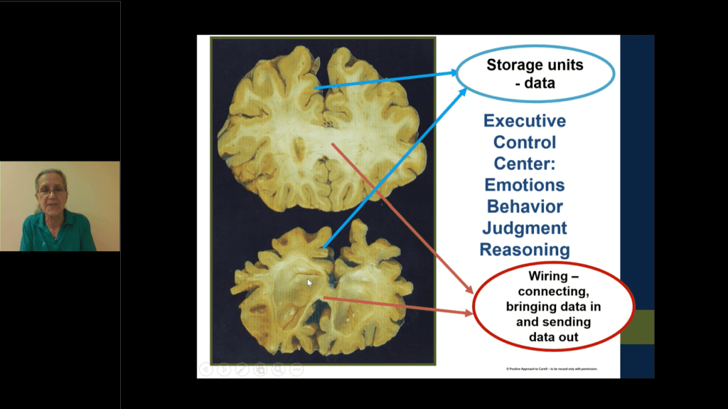 Dementia brains have lost their connectivity, she says. She explained that the top part of the brain contains white matter, “the wiring.” It is the part of the brain that allows you to get data from one part of the brain to another.